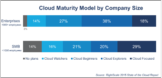 Érdekes a nagyvállalatok (enterprise) és a közepesek (SMB – small and medium business) összehasonlítása. Az előbbieknek csak 3%-át nem érdekli a felhő, az SMB-k esetében ez az arány 14%-os. A válaszokból úgy látszik, hogy a közepes méretűek hamarabb hozták meg a döntésüket, sokkal nagyobb arányban vannak már erősen benne a felhőben. (Megjegyzés: az SMB felső határa az ezer alkalmazott volt – mifelénk az már nagynak számít). Érdekes, hogy az előző évhez képest csökkent a nagyvállalati körben a felhőt intenzíven használó aránya (22-ről 18%-ra), de összességében nőtt azoknak az aránya, amelyek több alkalmazást futtatnak a felhőben (47-ről 56%-ra). Mi lehet ennek az oka? Talán valami módszertani változás a felmérésben?