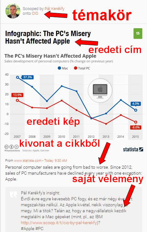 Erre szolgál a scoop.it. Mi ez, és hogy működik? Ez egy content curation rendszer, amiben témák szerint tudom rendezni az olvasott cikkeket, és egyben újra közzé is tudom tenni őket. Eközben hozzáfűzhetem a saját megjegyzéseimet és elláthatom kulcsszavakkal. Sőt, még azt is meghatározhatom, hogy milyen kép jelenjen meg a szöveg mellett. A képet általában az eredeti cikkből választom, de néha előfordul, hogy nincs benne vagy nem kapcsolódik a témához. Akkor keresek egy megfelelőt. (Amint korábban már írtam, kép nélkül nem érdemes írni a közösségi terekben – sokkal kevesebben veszik észre. Viszont nem illik oda nem illő képpel átverni az olvasót.)