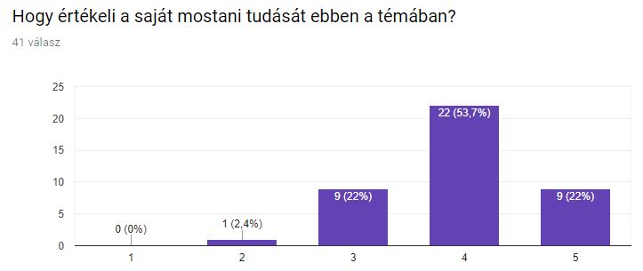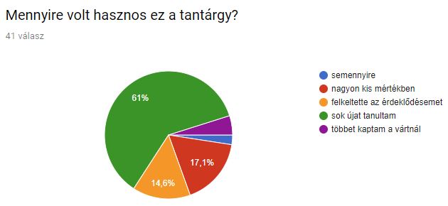 - A tantárgy hasznosságáról: 5% többet kapott a vártnál, 61% mondta, hogy sok újat tanult. 17% szerint nagyon kis mértékben volt hasznos, egyikük szerint semennyire.