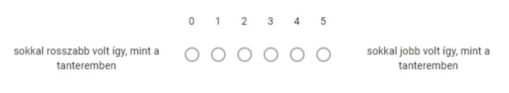 Hat válaszlehetőséget adtam meg, a sokkal rosszabb és a sokkal jobb között voltak még fokozatok is, de “semleges” választ nem lehetett adni, nem volt középső érték. Nem akartam hagyni, hogy kibújjanak a határozott válasz alól. (Így is ki lehetett volna bújni, mert ezek nélkül a válaszok nélkül is be lehetett küldeni a kérdőívet, de válaszoltak a hallgatóim.)